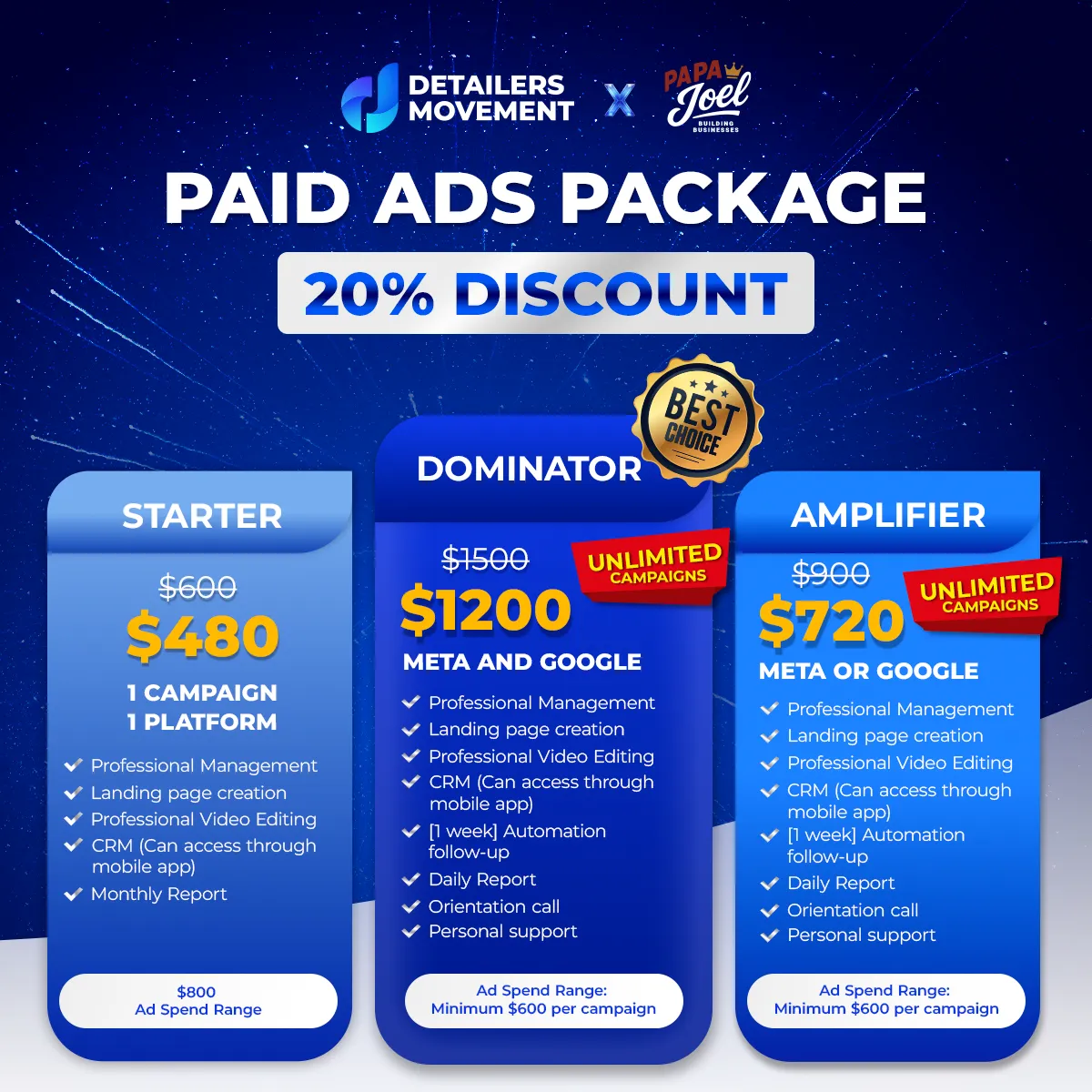 • Starter – $480: 1 campaign on 1 platform (Ad spend: $800 range)